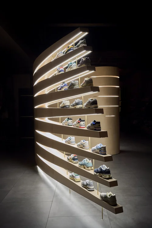 Using New Balance’s logo as inspiration, we sliced through an organic form, creating a main statement piece for their shoe collection.